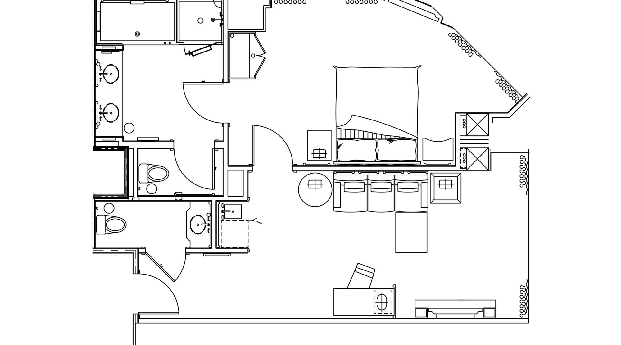Discover dramatic city views in our Corner Suite, where sweeping vistas meet modern luxury. This 741-square-foot retreat is a masterpiece of design, featuring elegant window sheers, crisp white linens, and an oversized tufted headboard – all thoughtfully curated with contemporary ease.
