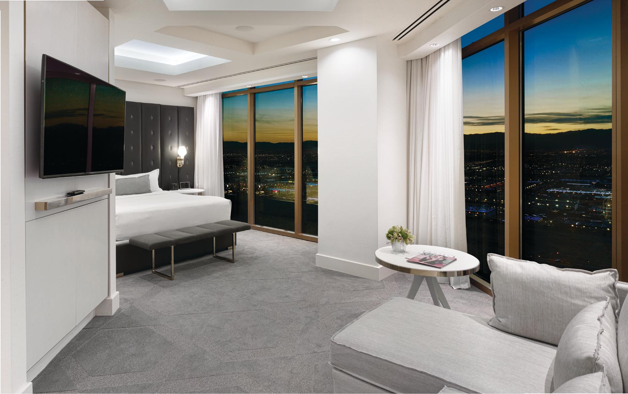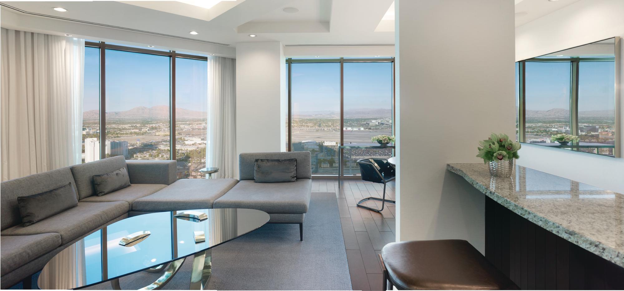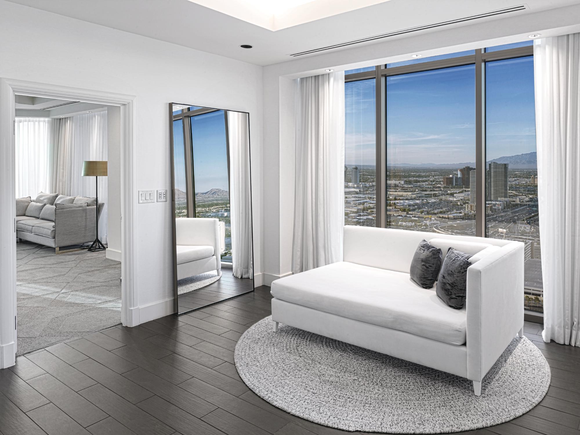 Stretch out and unwind with spectacular Strip views from our 1,516-square-foot Penthouse Panoramic Suite – a dramatic retreat framed by floor-to-ceiling windows offering 180-degree cityscapes. A sophisticated neutral palette meets elegant window sheers, crisp white linens, and oversized tufted headboards touched with subtle gold accents. The private bedroom features a spa-style bathroom for rejuvenation, while a separate living area with powder room creates space to relax and recharge. For more information or reservation assistance please call Luxury Reservations at 844.789.7792.